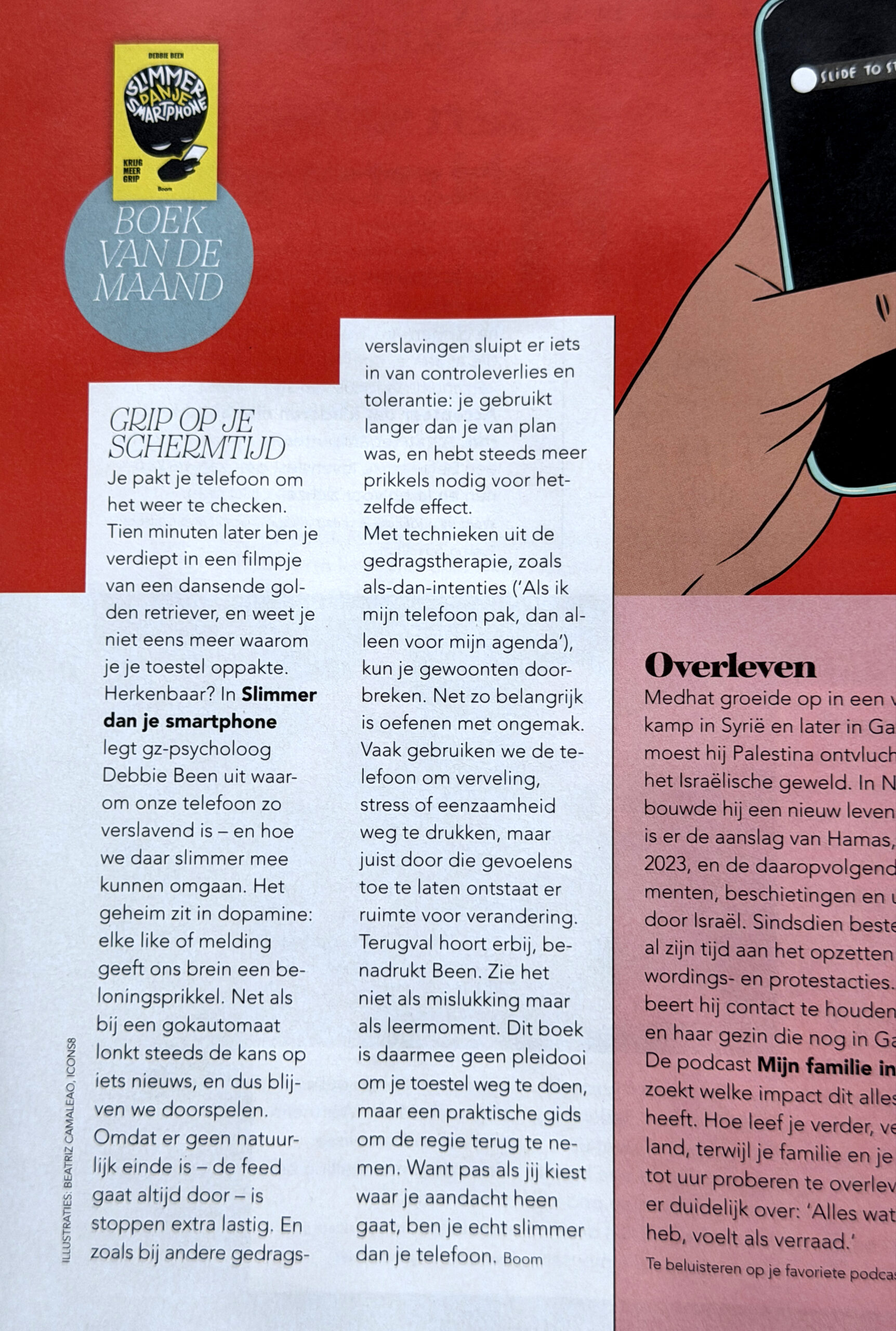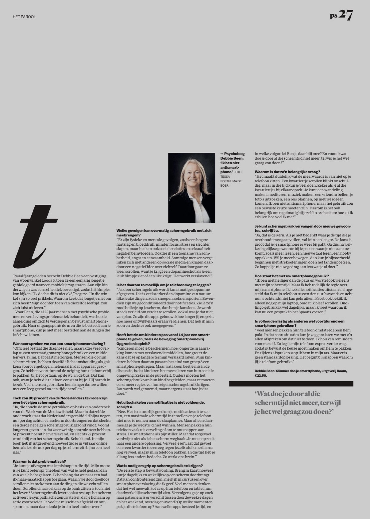 IN DE MEDIA Over smartphone verslaving en psychologie Een selectie van interviews en bijdrages in tijdschriften, kranten en tv RADIO 538 - 2025 Interview naar aanleiding van Slimmer dan je smartphone AD- 2025 Interview naar aanleiding van Slimmer dan je smartphone Lees het artikel van het AD hier Parool - 2025 Interview naar aanleiding van Slimmer dan je smartphone Lees het artikel van het Parool hier NU.nl- 2025 Interview naar aanleiding van Slimmer dan je smartphone Lees het artikel van NU.nl hier Psychologie Magazine - 2025 Boek van de maand Trouw - 2025 Interview naar aanleiding van Slimmer dan je smartphone Lees het artikel van Trouw hier Noordhollands Dagblad - 2025 Interview naar aanleiding van Slimmer dan je smartphone RTL Nieuws - 2025 Interview naar aanleiding van Slimmer dan je smartphone Lees het artikel van RTL Nieuws hier RINO Groep - 2025 Interview naar aanleiding van Slimmer dan je smartphone Lees het artikel van RINO Groep hier NH NIEUWS - 2025 Interview naar aanleiding van Slimmer dan je smartphone RADIO NOORDZEE - 2025 Interview naar aanleiding van Slimmer dan je smartphone OMROP FRYSLÂN RADIO - 2025 Interview naar aanleiding van Slimmer dan je smartphone Leeuwarder Courant - 2025 Over overprikkeling Amsterdam Dance Event - 2023 Spreker over smartphones en uitgaan Spreaker ADE Rodi Media Haarlem - 2023 Over smartphone verslaving en social media Lees het artikel van Rodi Media Haarlem hier Flow Magazine - 2022 Over smartphone verslaving en social media Lees het artikel van Flow Magazine hier RTV Noord Holland - 2020 Over de psychische gezondheid tijdens corona Lees het artikel van RTVNH hier Psychologie Magazine - 2019 Over smartphone verslaving en social media Lees het artikel van Psychologie Magazine hier AvroTros EenVandaag tv - 2017 Over smartphone verslaving Bekijk het AvroTros EenVandaag tv item hier NPO Radio1 Dit is de dag - 2017 Over smartphonegebruik op vakantie Luister het NPO Radio 1 – Dit is de dag interview hier NRC - 2015 Over smartphone verslaving Lees het NRC artikel hier NOS Online - 2015 Over smartphonegebruik op vakantie Lees het NOS Online artikel hier De Psycholoog - 2015 Over smartphone verslaving en social media Margriet - 2014 Over angsten en fobieën AD - 2013 Over smartphoneverslaving Dentz - 2013 Over angst voor de tandarts Attent - 2013 Over EMDR Margriet - 2012 Over de eerste liefde Psychologie Magazine - 2010 Over het KRO tv programma De Rode Kamer Micro Gids, Veronica Magazine & Leeuwarder Courant - 2009 / 2010 Over het KRO tv programma De Rode Kamer