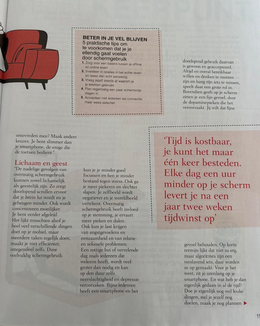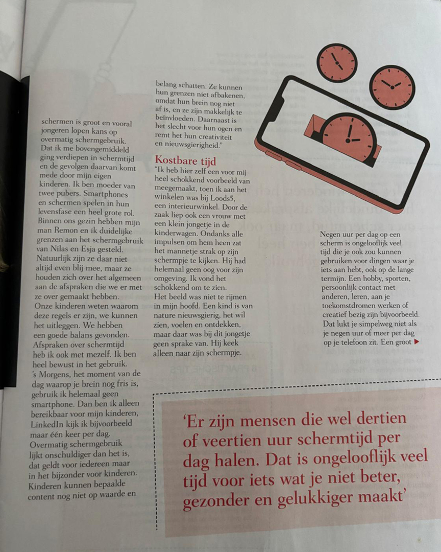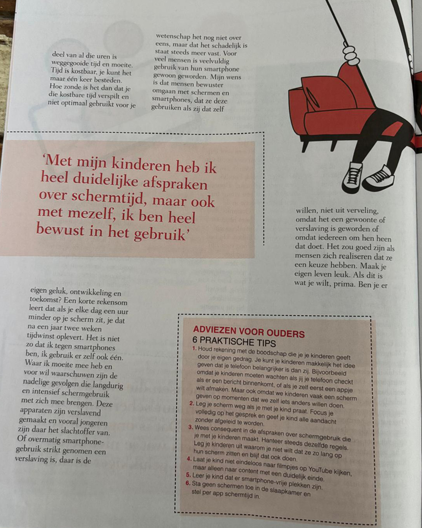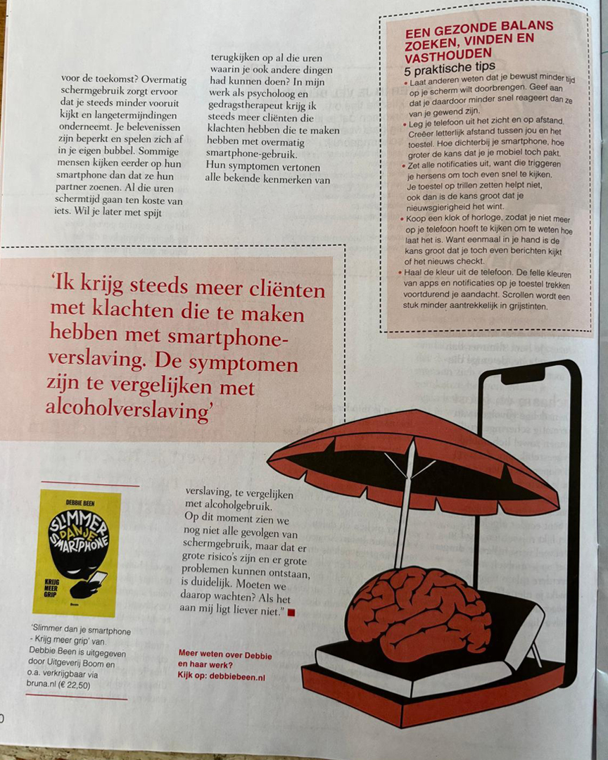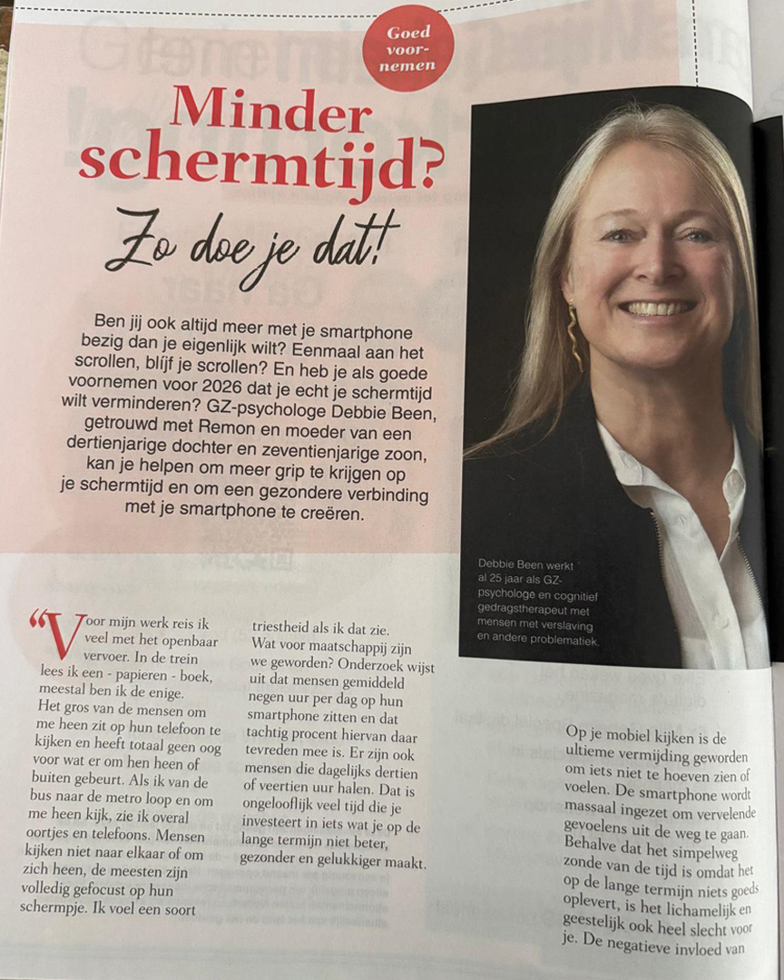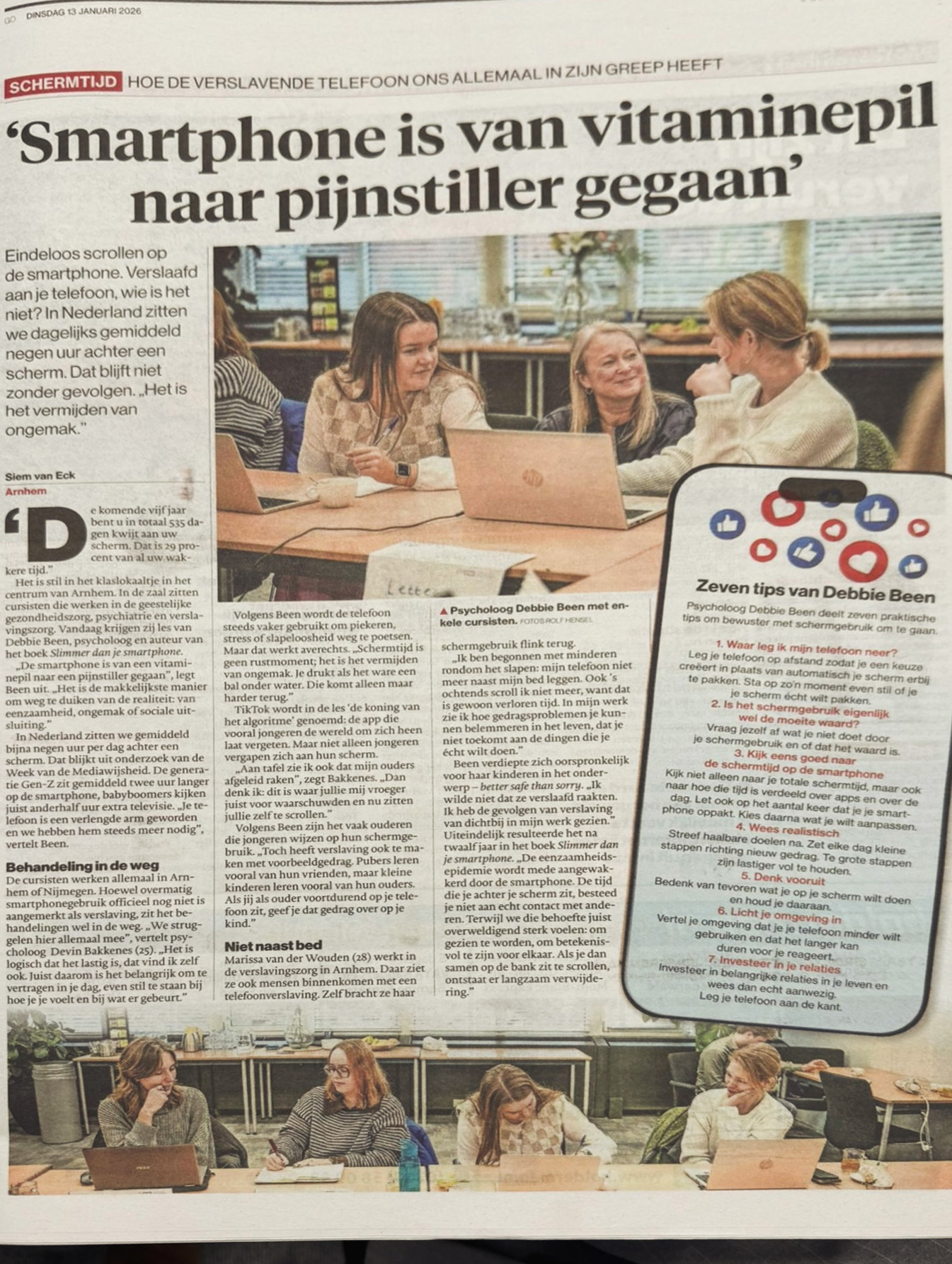 IN DE MEDIA Over smartphone verslaving en psychologie Een selectie van interviews en bijdrages in tijdschriften, kranten en tv TROUW- 2026 Opiniestuk: "Een verbod op sociale media voor jongeren is veel te makkelijk" Lees het opiniestuk in Trouw hier De Gelderlander- 2026 Interview tijdens cursusdag voor psychologen over smartphoneverslaving Lees het artikel van De Gelderlander hier Mijn Geheim- 2026 Interview naar aanleiding van Slimmer dan je smartphone RADIO 538 - 2025 Interview naar aanleiding van Slimmer dan je smartphone AD- 2025 Interview naar aanleiding van Slimmer dan je smartphone Lees het artikel van het AD hier Parool - 2025 Interview naar aanleiding van Slimmer dan je smartphone Lees het artikel van het Parool hier NU.nl- 2025 Interview naar aanleiding van Slimmer dan je smartphone Lees het artikel van NU.nl hier Psychologie Magazine - 2025 Boek van de maand Trouw - 2025 Interview naar aanleiding van Slimmer dan je smartphone Lees het artikel van Trouw hier Noordhollands Dagblad - 2025 Interview naar aanleiding van Slimmer dan je smartphone RTL Nieuws - 2025 Interview naar aanleiding van Slimmer dan je smartphone Lees het artikel van RTL Nieuws hier RINO Groep - 2025 Interview naar aanleiding van Slimmer dan je smartphone Lees het artikel van RINO Groep hier NH NIEUWS - 2025 Interview naar aanleiding van Slimmer dan je smartphone RADIO NOORDZEE - 2025 Interview naar aanleiding van Slimmer dan je smartphone OMROP FRYSLÂN RADIO - 2025 Interview naar aanleiding van Slimmer dan je smartphone Leeuwarder Courant - 2025 Over overprikkeling Amsterdam Dance Event - 2023 Spreker over smartphones en uitgaan Spreaker ADE Rodi Media Haarlem - 2023 Over smartphone verslaving en social media Lees het artikel van Rodi Media Haarlem hier Flow Magazine - 2022 Over smartphone verslaving en social media Lees het artikel van Flow Magazine hier RTV Noord Holland - 2020 Over de psychische gezondheid tijdens corona Lees het artikel van RTVNH hier Psychologie Magazine - 2019 Over smartphone verslaving en social media Lees het artikel van Psychologie Magazine hier AvroTros EenVandaag tv - 2017 Over smartphone verslaving Bekijk het AvroTros EenVandaag tv item hier NPO Radio1 Dit is de dag - 2017 Over smartphonegebruik op vakantie Luister het NPO Radio 1 – Dit is de dag interview hier NRC - 2015 Over smartphone verslaving Lees het NRC artikel hier NOS Online - 2015 Over smartphonegebruik op vakantie Lees het NOS Online artikel hier De Psycholoog - 2015 Over smartphone verslaving en social media Margriet - 2014 Over angsten en fobieën AD - 2013 Over smartphoneverslaving Dentz - 2013 Over angst voor de tandarts Attent - 2013 Over EMDR Margriet - 2012 Over de eerste liefde Psychologie Magazine - 2010 Over het KRO tv programma De Rode Kamer Micro Gids, Veronica Magazine & Leeuwarder Courant - 2009 / 2010 Over het KRO tv programma De Rode Kamer